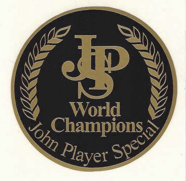 JPS John Player Special World Champions Sticker, round sticker measures approximately 55mm in diameter and cut to shape, the white square that you see is backing paper.